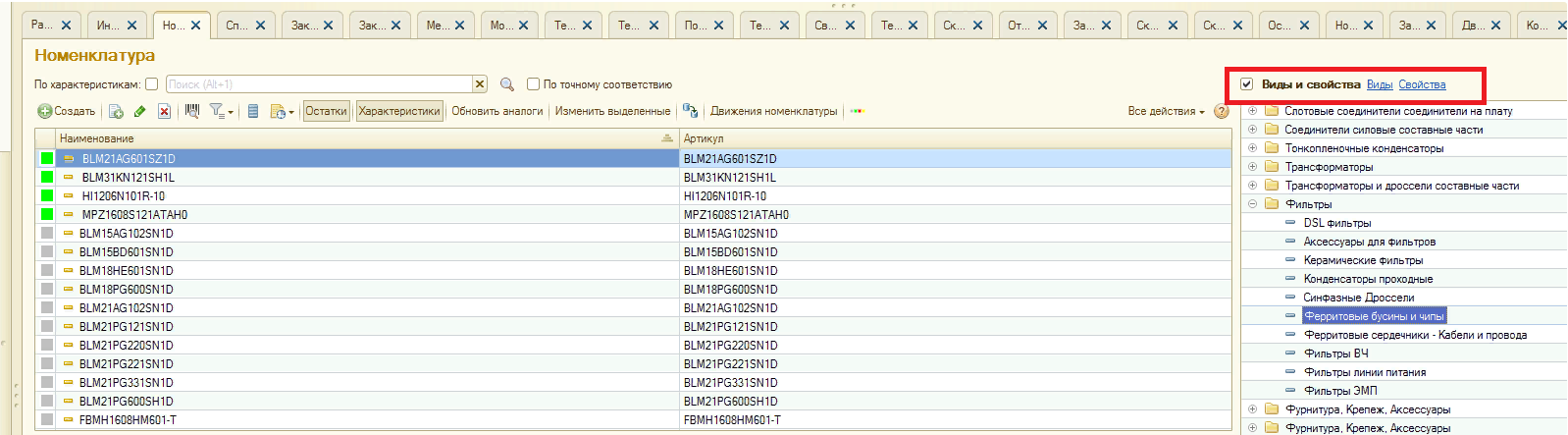 Например, отбираем в списке номенклатуру по виду номенклатуры «Холодильники» и свойству (тип холодильника – «Встраиваемый»). В списке Номенклатура будут показываться только те значения, которые используются в карточках номенклатуры.