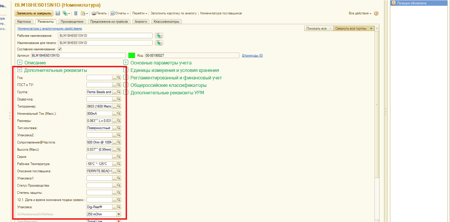 Введенные дополнительные реквизиты автоматически отображаются на закладке Реквизиты, раздел Дополнительные реквизиты в карточке номенклатуры.