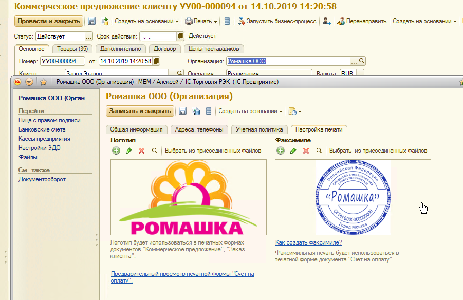 В настройках печати для организации привязывается логотип и факсимиле (печать с подписью)