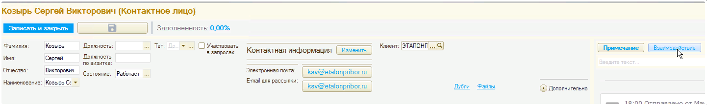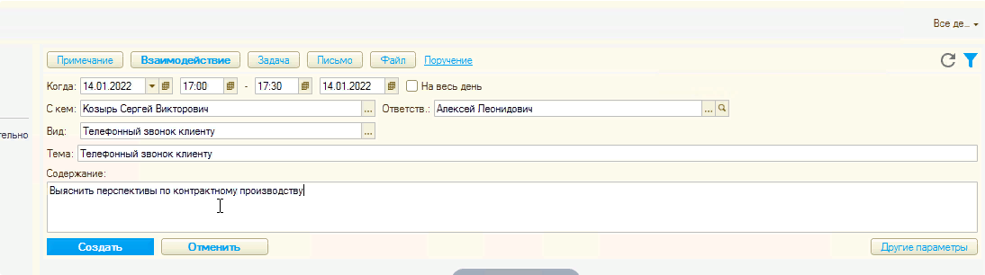 В карточке контактного лица создаем взаимодействие - телефонный звонок
