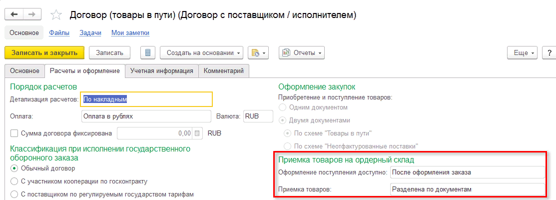 При использовании договоров с поставщиками вариант приемки товаров на ордерный склад определяется с помощью переключателей Оформление поступления доступно и Приемка товаров в карточке договора на закладке Расчеты и оформление.