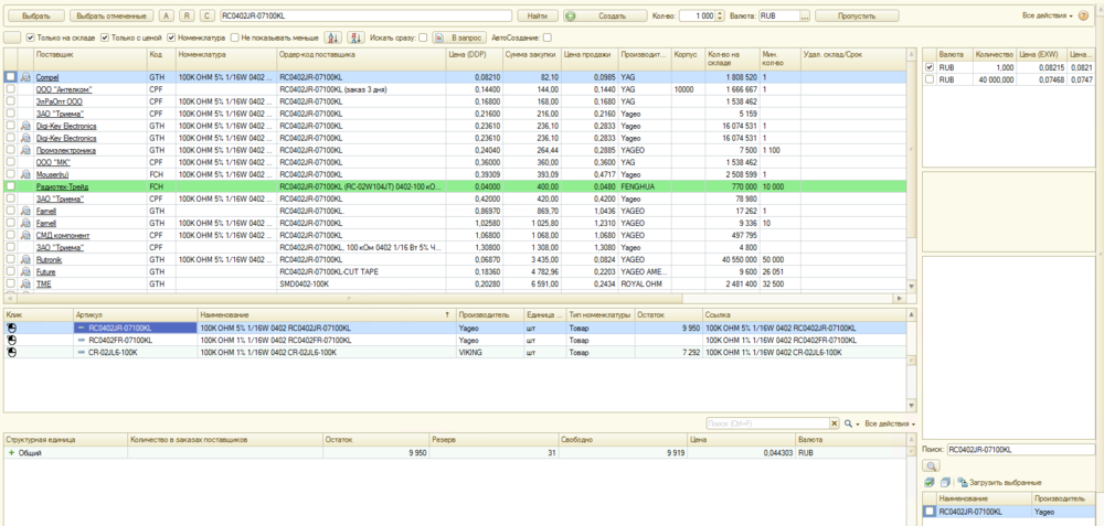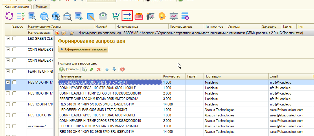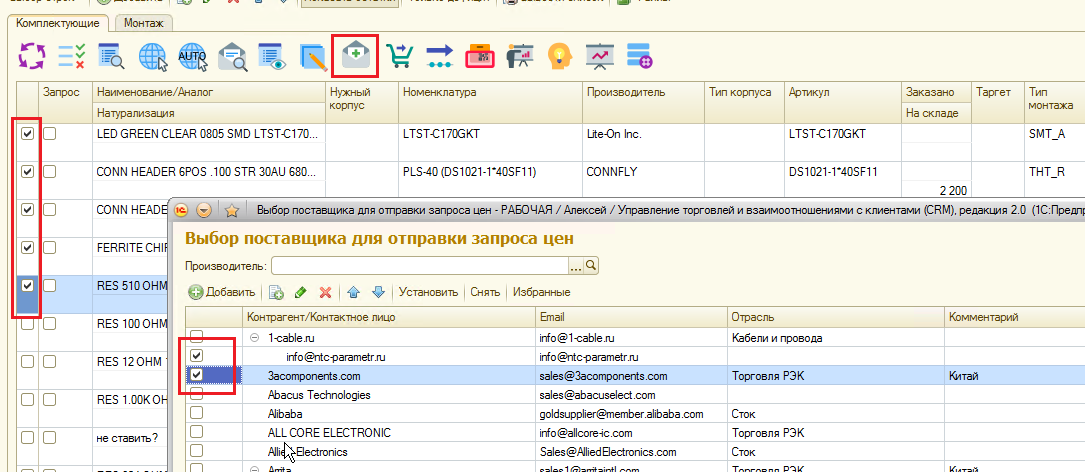 Необходимо выбрать нужные строки, нажать кнопку формирования запроса поставщикам, и выбрать нужных поставщиков