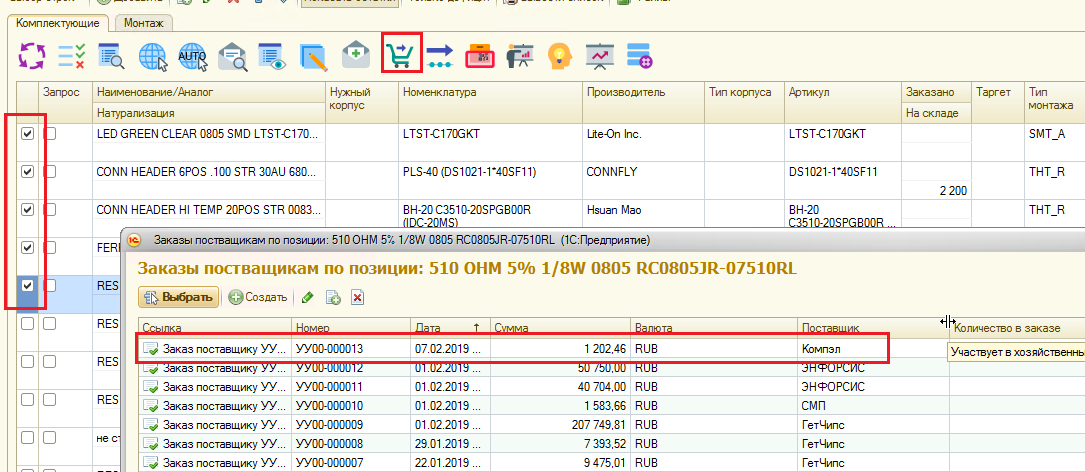 Выбранные позиции можно добавить в новый или существующий заказ поставщика.