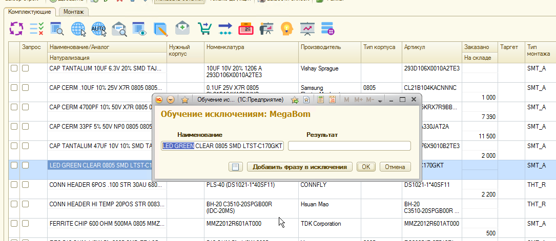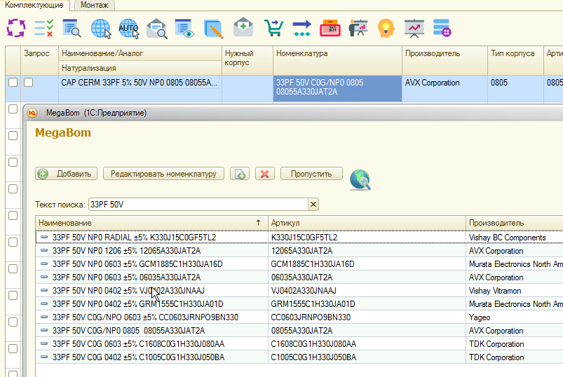 Текстовое или выбор номенклатуры из справочника (используется для создания спецификаций изделий в приборостроении)