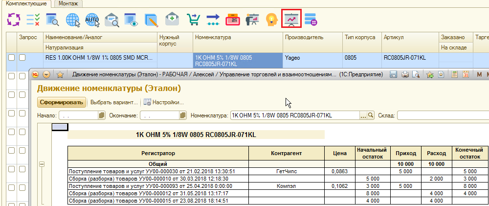 История движения номенклатуры, от кого, сколько, по какой цене поступило, и куда и сколько по какой цене ушло.