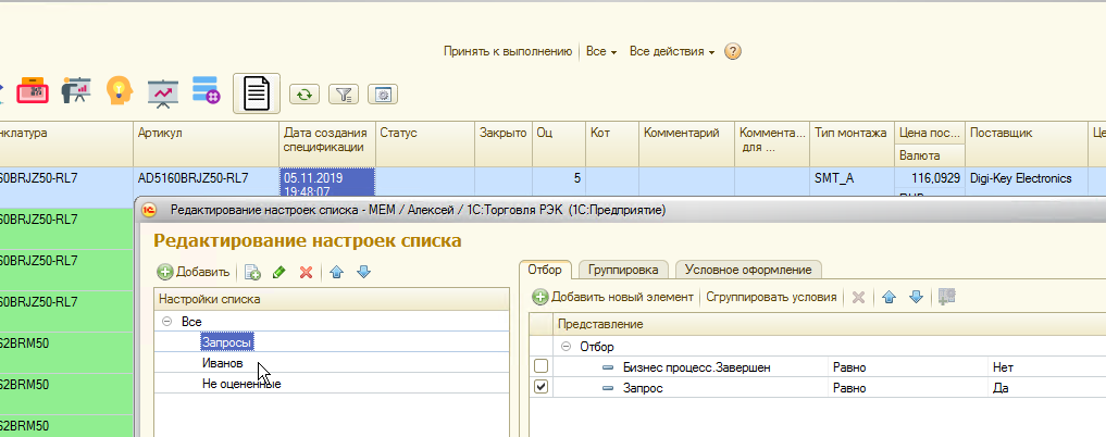 Менеджер по закупкам может настроить различные групповые фильтры для отображения позиций к оценке,