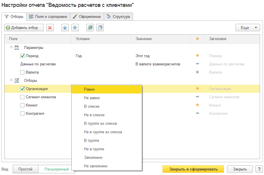 - Простой – позволяет менять настройки, которые не требуют последующего сохранения варианта отчета. Такие настройки будут применены при следующем открытии отчета. В состав простых настроек могут входить отборы, выводимые поля, сортировка и структура отчета.