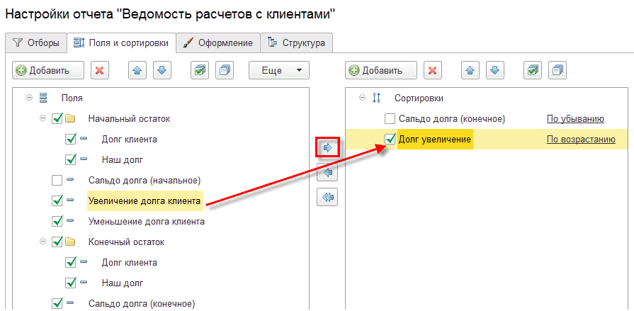 - На закладке Поля и сортировки определяется необходимый состав полей для вывода в отчет (раздел Поля) и устанавливаются правила упорядочивания выводимых в отчете данных (раздел Сортировки).