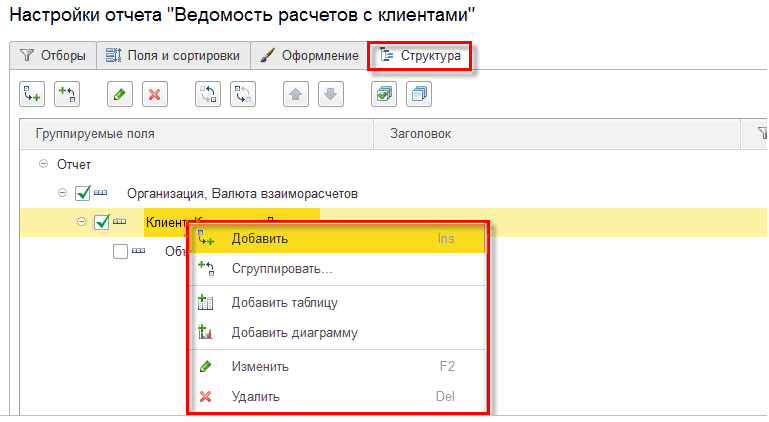 ○ добавление вложенных и вышестоящих группировок.