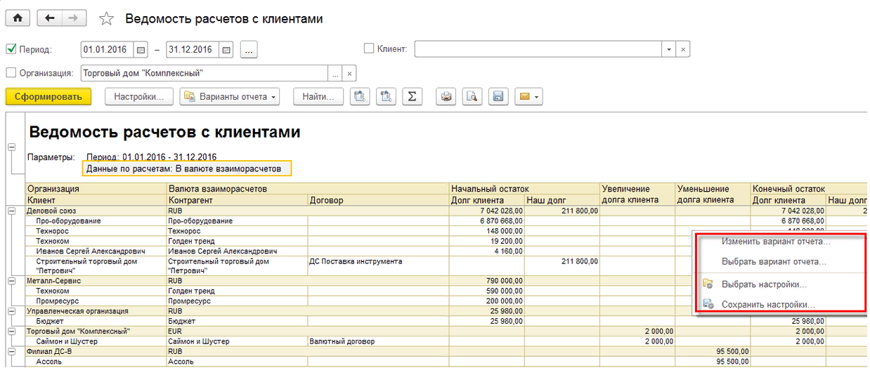 Для работы с вариантами отчетов доступны следующие функции по кнопке Варианты отчета: