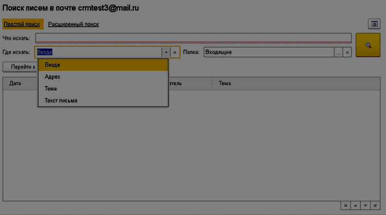 В форме «Простой поиск» поиск осуществляется в Адресе электронной почты, Теме, Тексте письма или везде если не выбрано где искать. А также в выбранной папке учетной записи, или если папка учетной записи не выбрана, то по всем папкам.