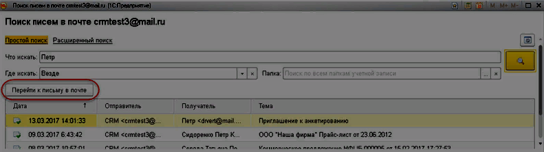 По кнопке «Перейти к письму в почте» курсор мыши фиксируется на данном письме в почте.