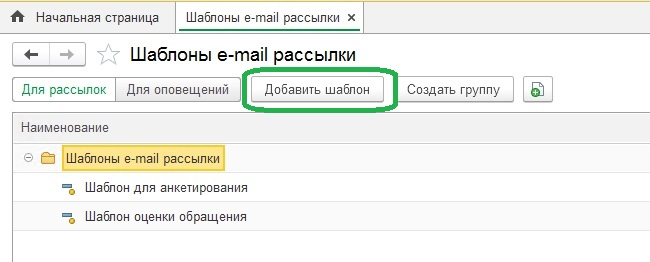 Приведем пример создания «Шаблона e-mail рассылки», который в дальнейшем можно использовать не только в рассылке электронных писем, но и в исходящем письме. В форме создания нового письма пользователь переходит по команде Заполнить из шаблона. В открывшемся списке нажимает кнопку «Добавить шаблон».
