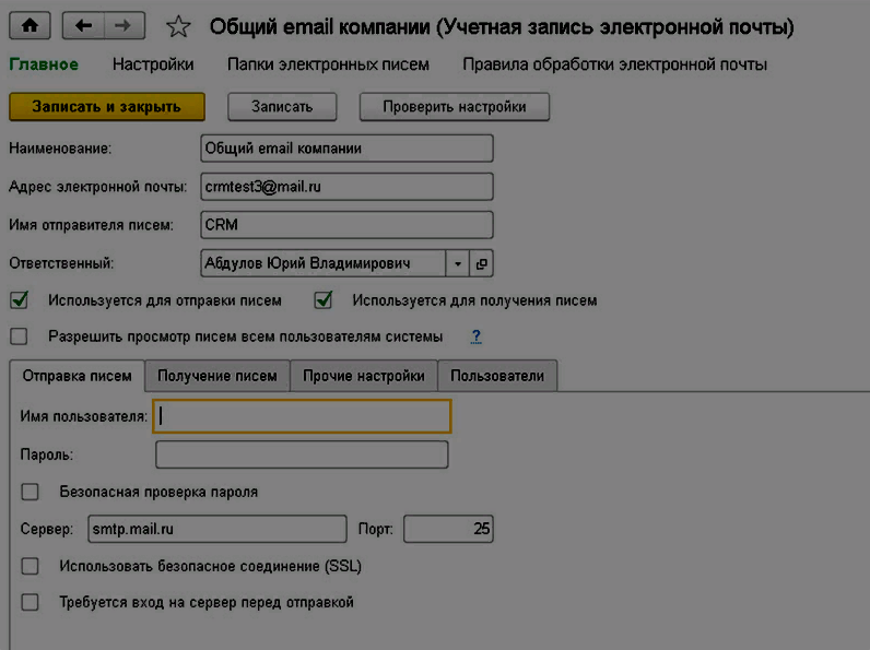 -Имя отправителя писем. Имя владельца учетной записи, которое будет указываться в корреспонденции, при этом оно может отличаться от имени пользователя в программе, например, пользователь «Администратор», а его имя «Иван Иванович».
