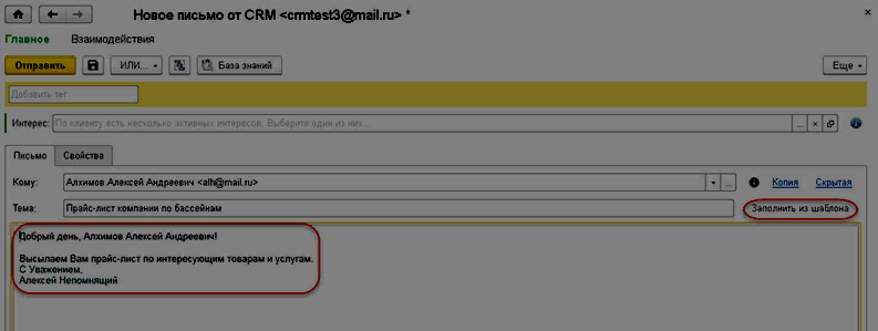 Пользователь сохраняет и закрывает форму. Теперь создает письмо, например, из Почты. В открывшейся форме исходящего письма добавляет Клиента в поле «Кому» и далее нажимает кнопку «Заполнить из шаблона». Выбирает необходимый шаблон и нажимает кнопку «Выбрать». Все заполнилось: