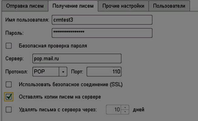 На закладке «Получение писем» указываются настройки сервера входящей почты.