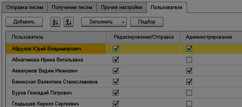 На закладке «Пользователи» задается список сотрудников, которым разрешена работа с письмами данной учетной записи. Установкой флажков определяются доступные действия пользователей с данной учетной записью.