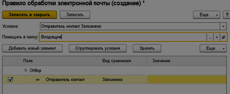По гиперссылке формы учетной записи электронной почты открывается форма «Правило обработки электронной почты». Здесь задаются правила обработки входящих писем.