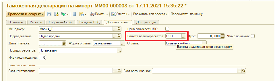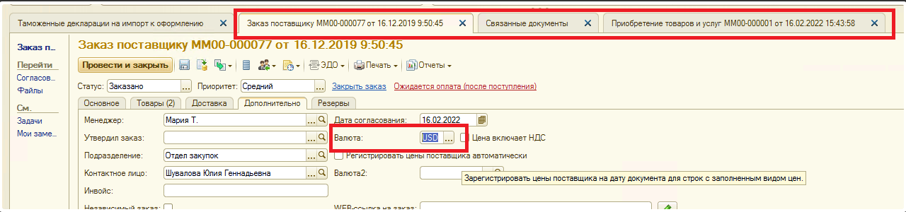 и после создания Приобретение товаров и услуг в Валюте и документа Таможенная декларация на импорт, при необходимости дозагрузить в документ Таможенная декларация измененные Цены по полученному от брокера Файлу и дополнительную информацию - актуально для случаев изменения Курса при долгосрочных поставках/отгрузках.