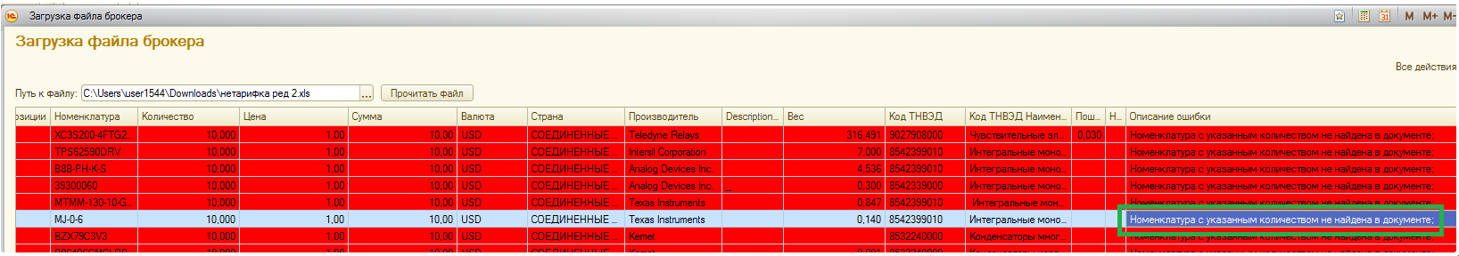 После переноса данных из Файла в табличную часть подвала Товары декларации раздела Товары декларации документа Таможенная декларация на импорт добавлена и выполняется автоматическую проверку на идентичность данных по строкам по колонкам Цена и Сумма, а также Итоговая сумма по табличной части подвала Товары декларации раздела Товары декларации документа Таможенная декларация на импорт. При наличии несоответствий выдается сообщение: