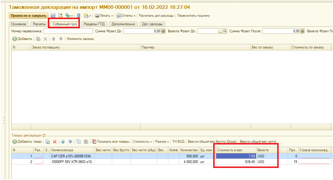 При этом в документе Таможенная декларация Валютные Цены, загруженные из Файла брокера будут сохранены в Разделе Собранный груз, а Цены в рублях на день документа будут Расположены в закладке Разделы ГТД.