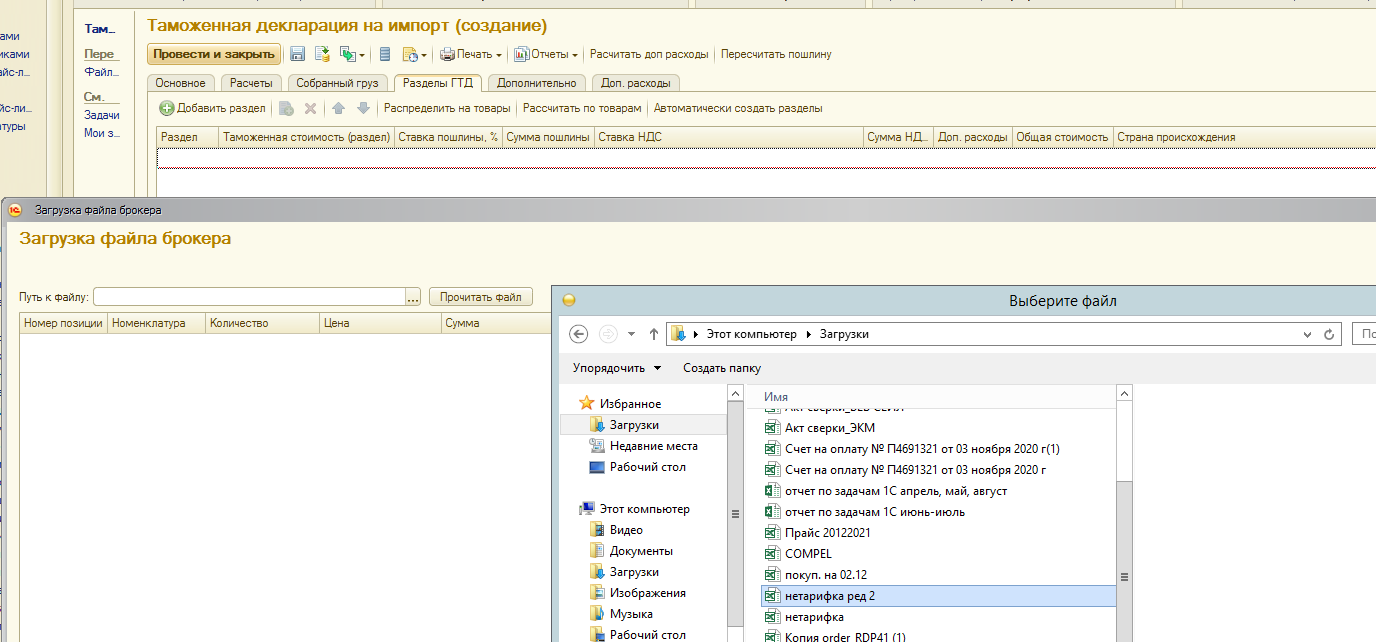 Расширенный функционал по документу Таможенная декларация - Загрузить Файл брокера