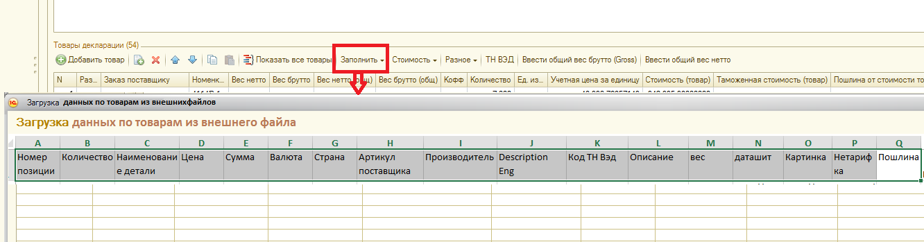 В документе Таможенная декларация на импорт открыть в закладке Разделы ГТД в подвал Товары декларации - Заполнить - Загрузить файл брокера