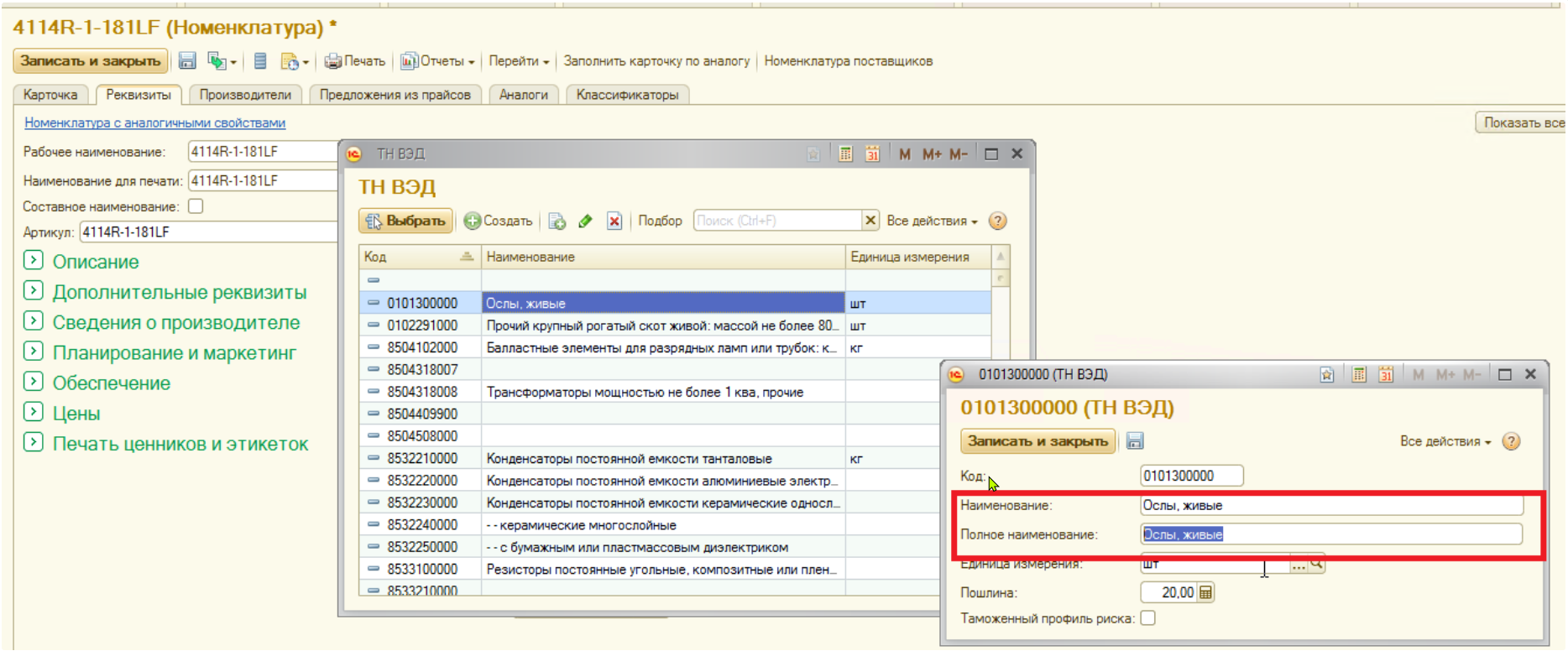 а) записывает значение Пошлина в Карточку номенклатуры в Код ТН ВЭД ячейку Пошлина