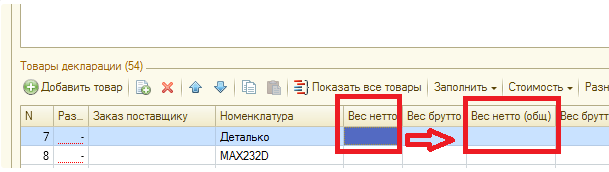 б) переносит значение Вес из колонки Файла/Карточки Номенклатуры в колонку Вес нетто в подвал Товары декларации раздела Товары декларации документа Таможенная декларация на импорт;