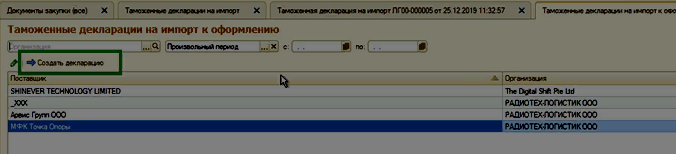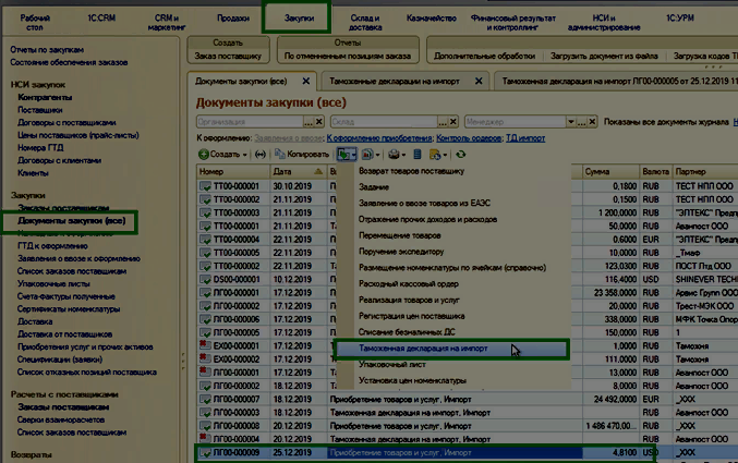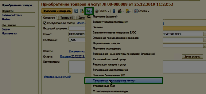 Курсор мыши устанавливаем на необходимый документ и нажимаем кнопку Создать на основании. В раскрывшемся списке выбираем Таможенная декларация на импорт.