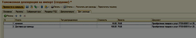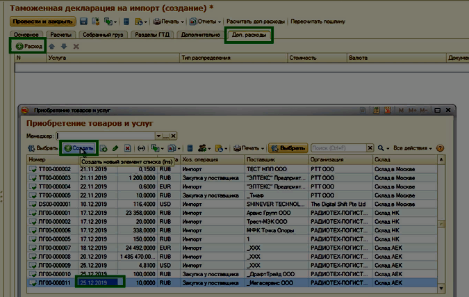 В данном списке необходимо по кнопке Создать сформировать новый документ(ы) Приобретение товаров и услуг, которым будут оприходованы все дополнительные расходы, такие как Доставка до границы, Доставка по РФ, Упаковка и прочее.