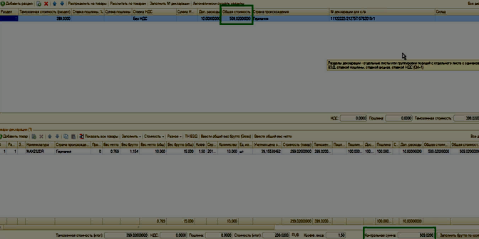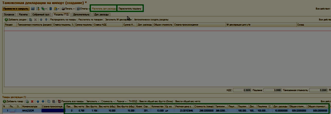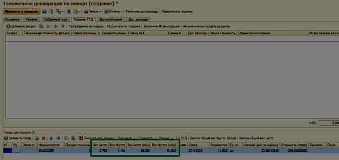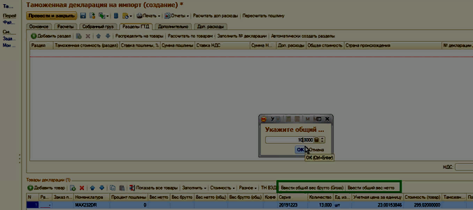 4.2 Для проведения дальнейших расчетов сумм пошлины и доп. расходов по строкам необходимо распределить общий вес брутто и нетто на каждую строку товара по кнопкам Ввести общий вес нетто и Ввести общий вес брутто.