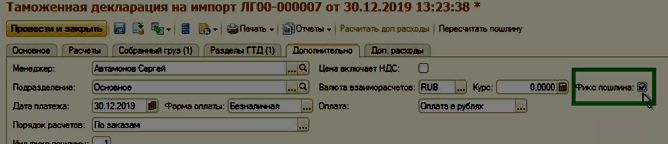 4.3 Далее, по кнопке Пересчитать пошлину производим автоматический пересчет пошлины по указанному в карточке номенклатуры % пошлины и с учетом доп. расходов на территории иностранного государства из закладки Доп. Расходы.