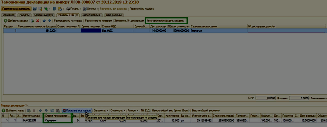После выполнения расчетов необходимо заполнить значения по колонке Страна происхождения и сформировать Разделы ГТД по кнопке Автоматически сформировать разделы.