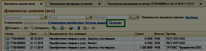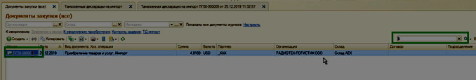 Для товаров, заказанных с типом операция = Импорт, после проведения документа Приобретение товаров и услуг необходимо создать документ Таможенная декларация на импорт.