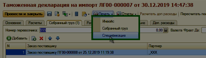 8. Из проведенного документа Таможенная декларация на импорт можно вывести на печать печатные формы Инвойс, Собранный груз, Спецификация.(опции подключаются отдельно)