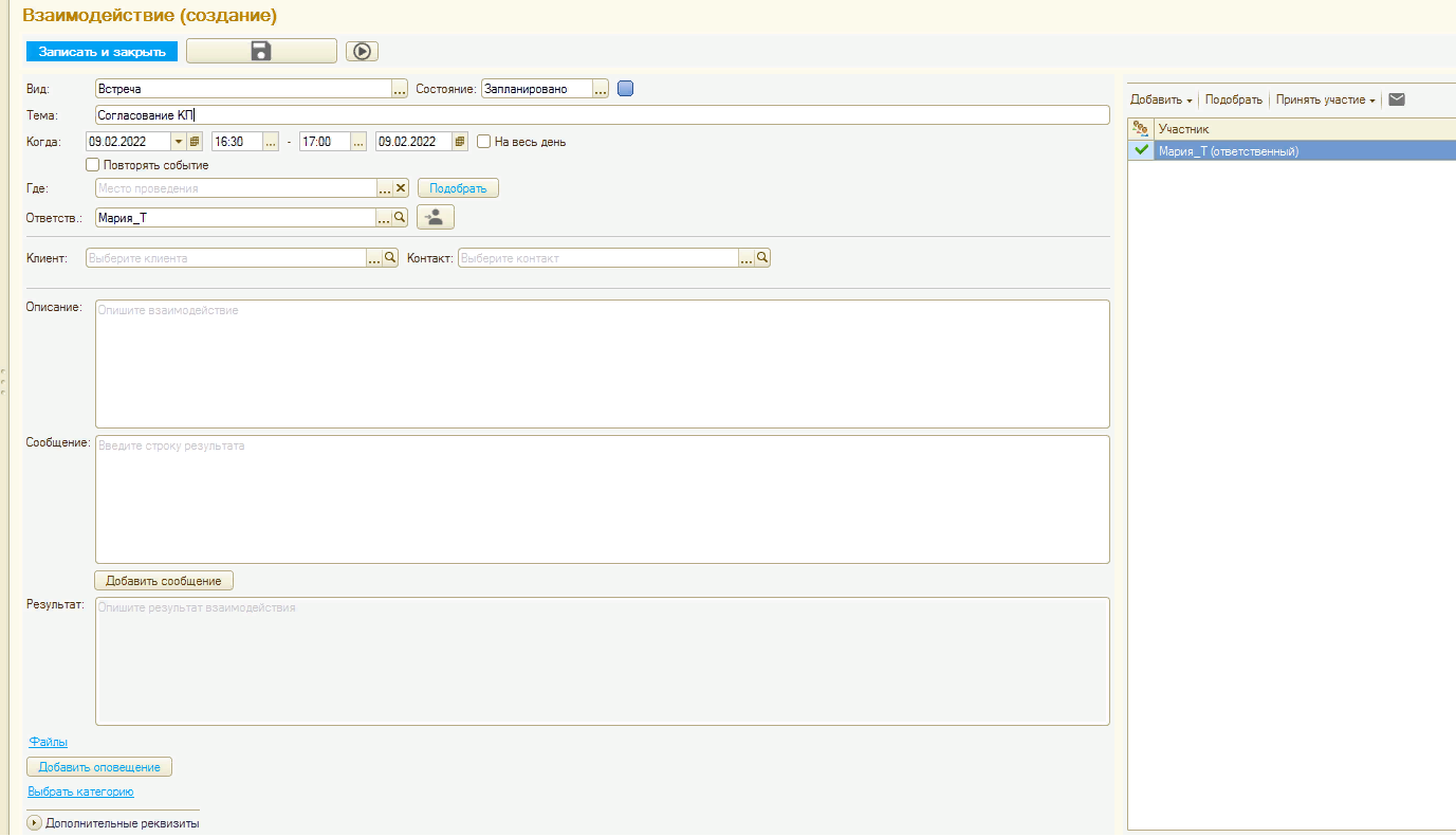 - контакт (объект) – с кем выполняется взаимодействие;