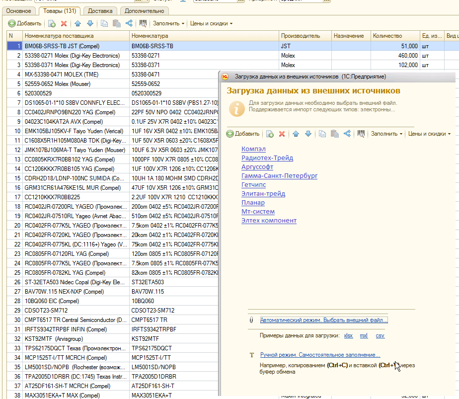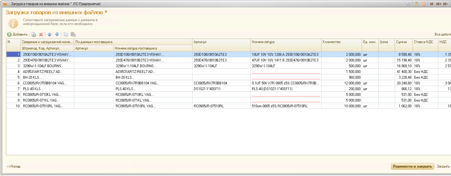 Процедура частично аналогична п.4, т.е. идентификация соответствия номенклатуры поставщика и номенклатуре в базе присутствует.