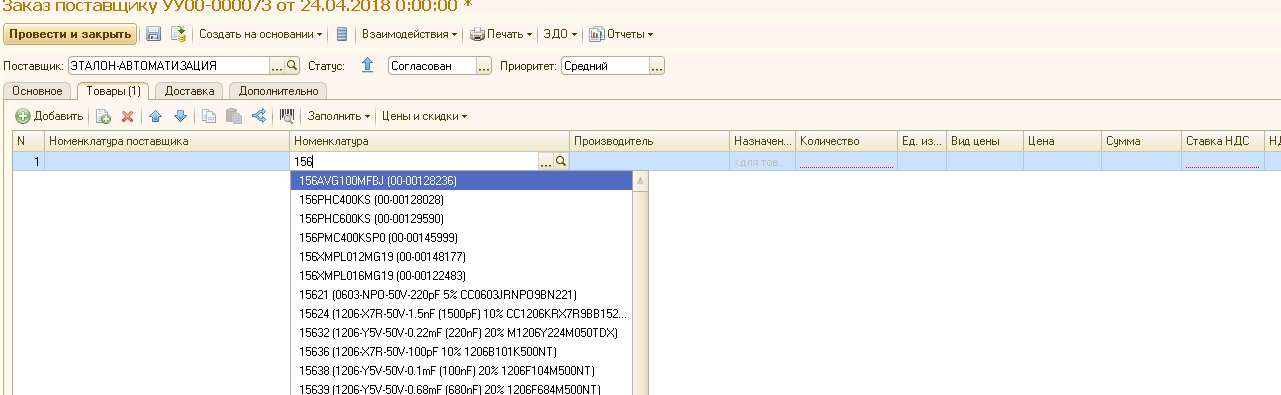или путем прямого поиска по вхождению заполняем заказ позициями, количества и ценами.