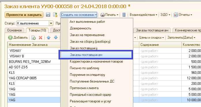 Заказ клиента может создаваться на основании спецификации УРМ. Поставщики, цены поставщиков и валюта должна быть заполнена, иначе цены поставщиков не перенесутся в заказы поставщиков.