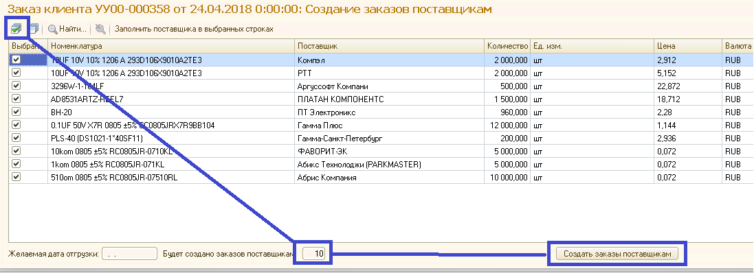Выбираем нужные строки, и создаем заказы поставщикам.