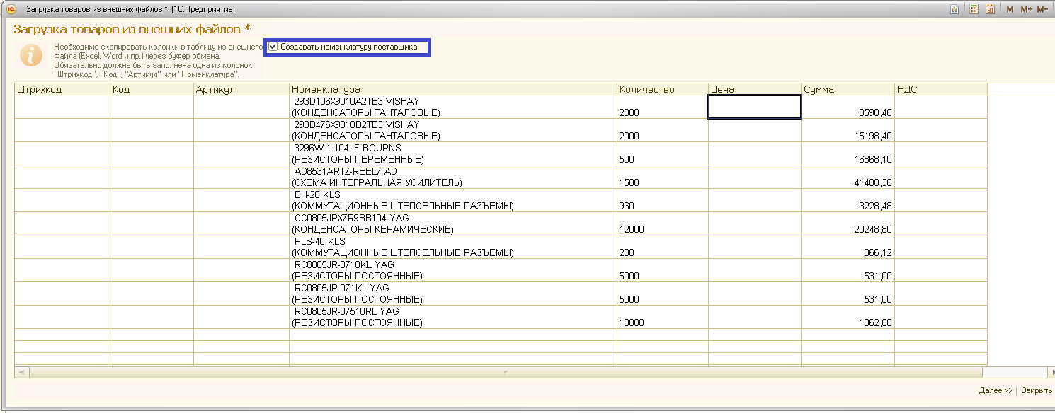 Копипастом из счета поставщика (excel, word) вставляем наименования, количество, цену, сумму, ндс,