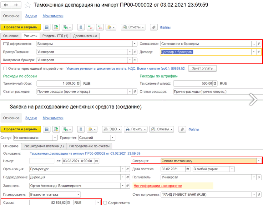 - Через брокера - ГТД оформляется брокером. Указывается информация о брокере, который регистрируется в качестве партнера с видом взаимоотношений Поставщик. Расчеты с таможней оформляет посредник (брокер). Предприятие оплачивает услуги, оказанные таможней, брокеру, а брокер сам регулирует отношения с таможней.