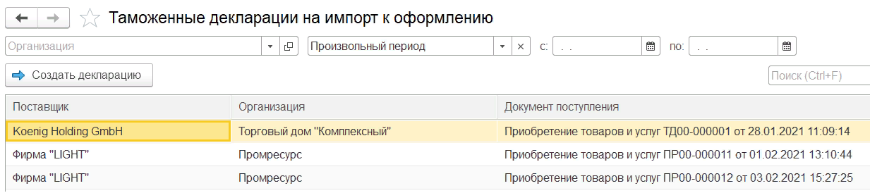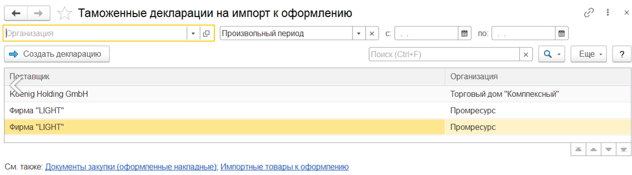 - Если функциональная опция отключена, то в рабочем месте Таможенная декларация на импорт к оформлению показывается список поставщиков-импортеров, по товарам которых не оформлена таможенная декларация.