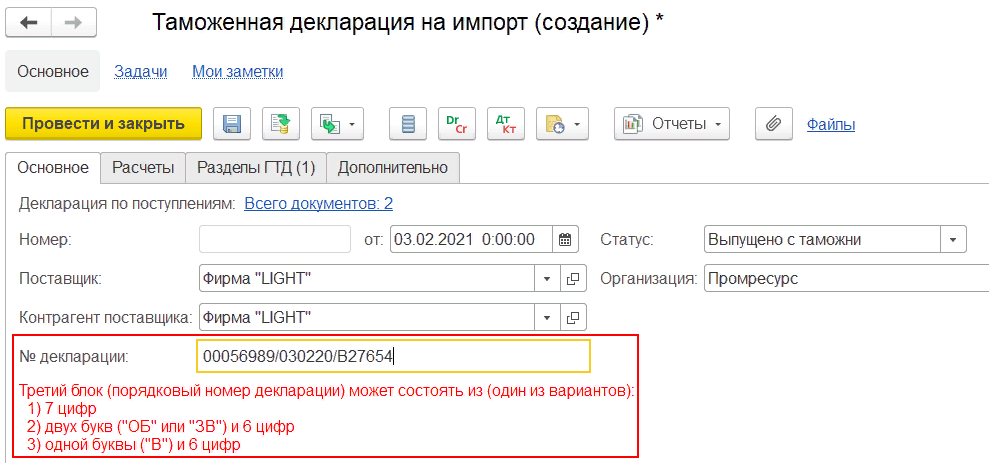 Значения, введенные поле Порядковый №, сохраняются в справочнике Номера ГТД в реквизите Номер декларации.