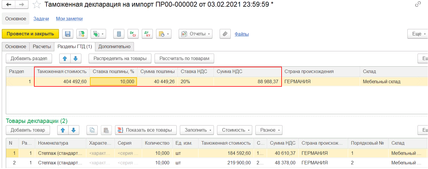 Заполнение информации о товарах, таможенных пошлинах и НДС.